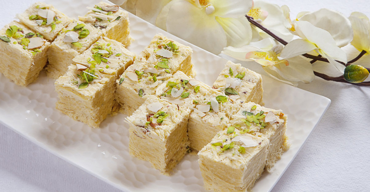 বাদাম কুচি করে কেটে হালকা ভেজে তুলে রাখুন। এবার একটি বড় প্যানে ঘি গরম করে তাতে ময়দা ও বেসন দিয়ে ভেজে নিন। এরপর অন্য একটি পাত্রে পানির সাথে চিনি মিশিয়ে সিরা তৈরি করে নিন। সিরা ঘন হবে। এবার তৈরি করা সিরার সাথে ভেজে রাখা বেসন ও ময়দা কাঁটা চামচ দিয়ে ভালোভাবে মিশিয়ে নিন।