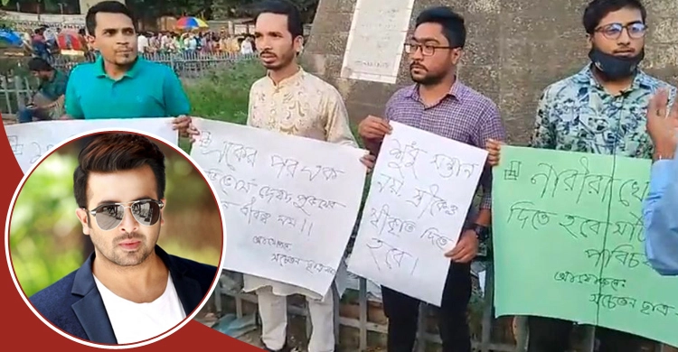 শনিবার (১৫ অক্টোবর) ঢাকা বিশ্ববিদ্যালয়ের রাজু ভাস্কর্যের সামনে সম্মিলিত ছাত্র সমাজের ব্যানারে শাকিব খানের বিরুদ্ধে মানববন্ধন করেছে একদল শিক্ষার্থী। মানববন্ধনে অংশ নেওয়া শিক্ষার্থীদের হাতে থাকা প্ল্যাকার্ডে লেখা ছিল, ‘নারীরা খেলনা নয়, দিতে হবে সঠিক পরিচয়’।