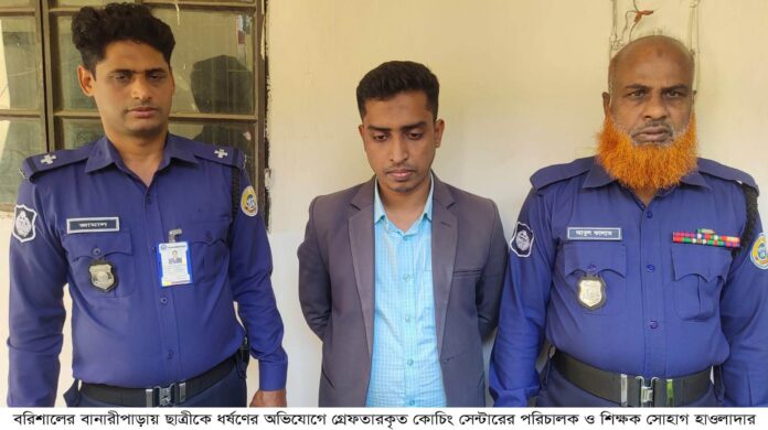 জাকির হোসেন, বানারীপাড়া(বরিশাল)প্রতিনিধ: বরিশালের বানারীপাড়ার চাখারে কলেজ ছাত্রীকে ধর্ষণের অভিযোগে কোচিং সেন্টারের পরিচালক ও এবি ব্যাংকের কর্মচারী সোহাগ হাওলাদারকে (৩৫) গ্রেফতার করেছে পুলিশ।