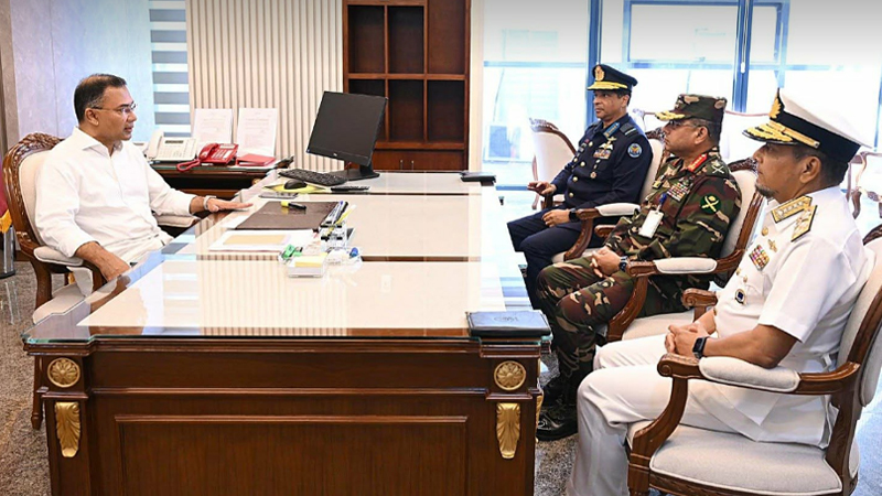 নিজস্ব প্রতিবেদক: আজ সকালে প্রধানমন্ত্রী তারেক রহমানের সঙ্গে সৌজন্য সাক্ষাৎ করেন সেনাবাহিনী প্রধান জেনারেল ওয়াকার-উজ-জামান, নৌবাহিনী প্রধান অ্যাডমিরাল মোহাম্মদ নাজমুল হাসান এবং বিমানবাহিনী প্রধান এয়ার চিফ মার্শাল হাসান মাহমুদ খাঁন। ছবি: পিআইডি